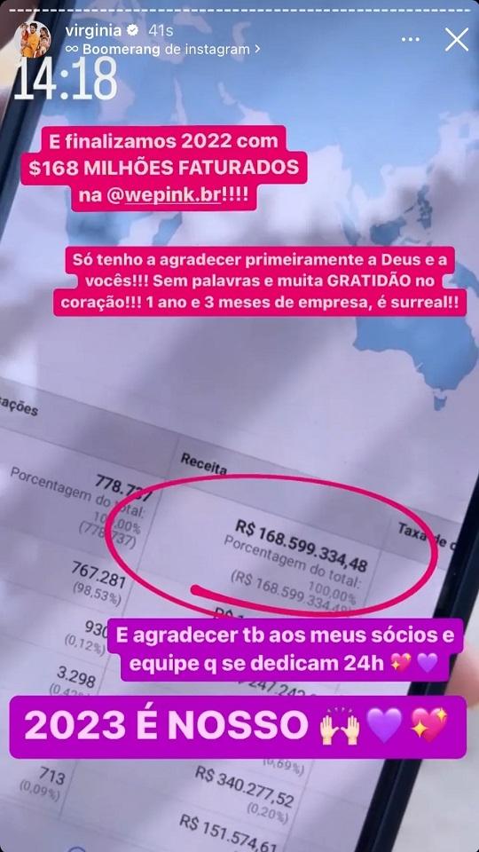 “E finalizamos 2022 com R$ 168 milhões faturados na @wepink.br! Só tenho a agradecer primeiramente a Deus e a vocês! Sem palavras e muita gratidão no coração! 1 ano e 3 meses de empresa, é surreal! E agradecer também aos meus sócios e equipe que se dedicam 24 horas”, escreveu Virgínia Fonseca.