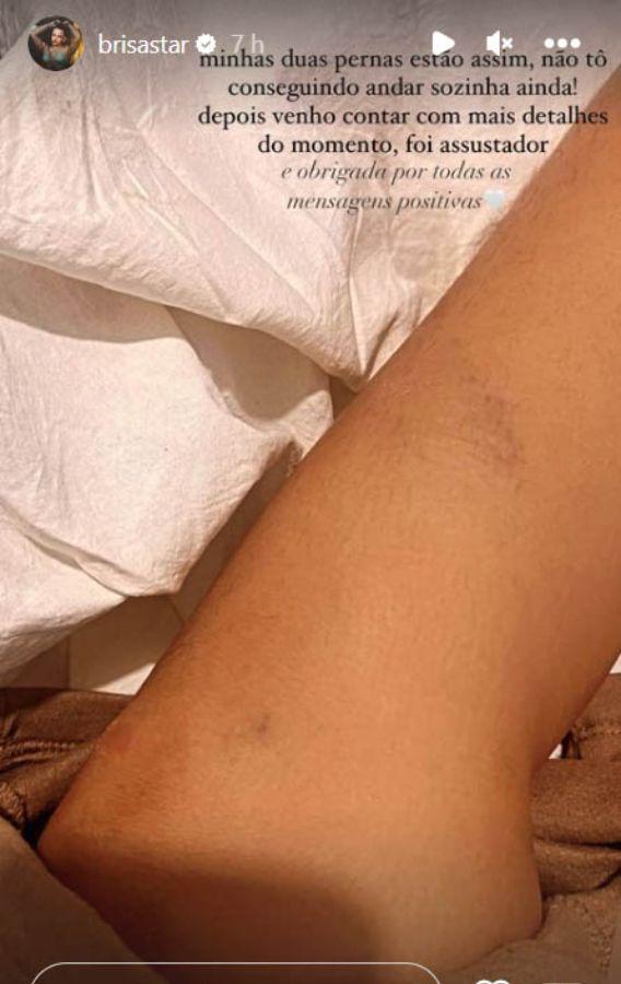 “Minhas duas pernas estão assim, não estou conseguindo andar sozinha ainda. Depois venho contar com mais detalhes o momento, foi assustador. E obrigada por todas as mensagens positivas”, começou ela.