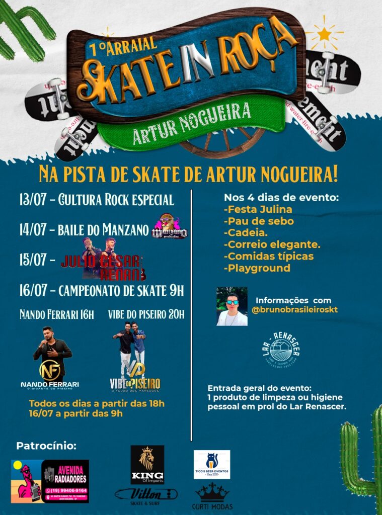 Um evento beneficente em apoio ao Lar Renascer será realizado em Artur Nogueira. O Skate In Roça acontecerá de 13 a 16 de julho e proporcionará uma união entre esporte, música, gastronomia e solidariedade na Pista de Skate, localizada na região central do município.