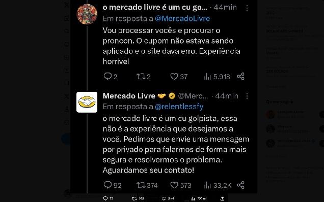 Uma ação promocional do Mercado Livre, neste sábado (25.nov), teve um resultado inesperado. Clientes que tiveram problemas para ativar os cupons usaram as redes sociais para reclamar, mas as respostas automáticas do perfil da empresa no X, antigo Twitter, chamaram mais atenção do que o problema.
