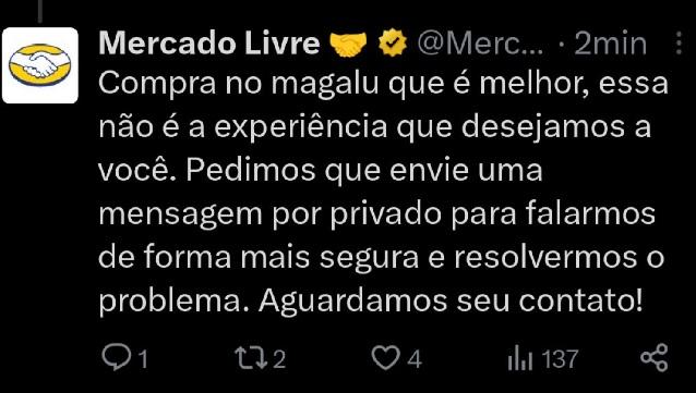 “O perfil do Mercado Livre não foi hackeado. Os comentários ofensivos que aparecem em respostas a usuários no perfil também não foram escritos pelos nossos times. Infelizmente, alguns usuários trocaram seu nome por frases ofensivas, que apareceram no início das respostas automatizadas da página da companhia no X (Twitter). Já resolvemos esta questão, mas seguimos aqui atentos para garantir que os usuários também tenham a melhor experiência em nossa rede. Caso algum usuário necessite de algum suporte, pode nos procurar pela nossa Central de Atendimento no App/Site”, justificou a empresa.
