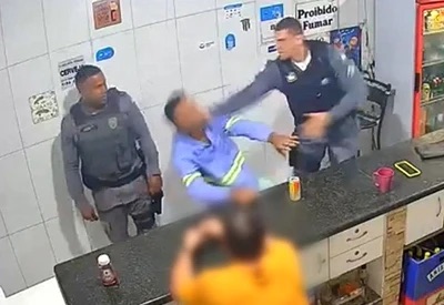 Nas imagens, dois PMs são vistos se aproximando do suspeito, que estava sentado, apoiado no balcão. Um policial afirmou que o homem teria cometido a agressão e, depois, deu uma bofetada no rosto do cliente, seguida de outras, derrubando o suspeito no chão.
