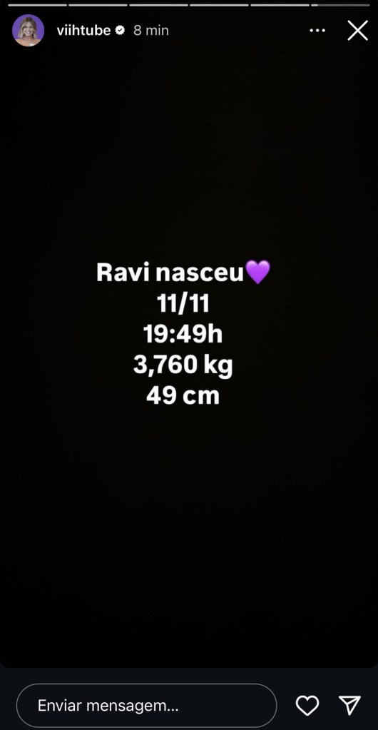 Nasceu na segunda-feira (11/11), Ravi, segundo filho de Viih Tube e Eliezer. O ex-BBB usou as redes sociais na manhã desta terça-feira (12/11) para comunicar o nascimento do filho.
