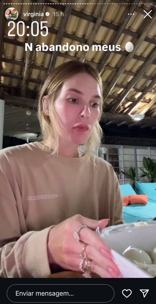 No vídeo, a influenciadora aparece com uma tigela de ovos cozidos. “Quantos ovos você come por dia, amor?”, perguntou o artista. “Acho que estou comendo uns 20”, respondeu Virginia, que está fazendo uma nova dieta após o nascimento do terceiro filho, José Leonardo.