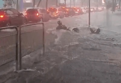 Nas imagens gravadas é possível ver água da chuva tomando conta das ruas com trânsito parado. Enquanto era levado pela tempestade, o motoqueiro tentava salvar sua moto na avenida. Contudo, a força da enxurrada levou o veículo para longe, até ficar preso em uma esquina.