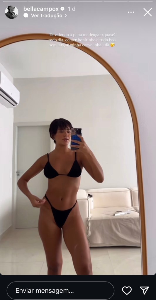 O registro foi publicado nesta segunda-feira (6). Bella apareceu com um biquíni preto em frente ao espelho.