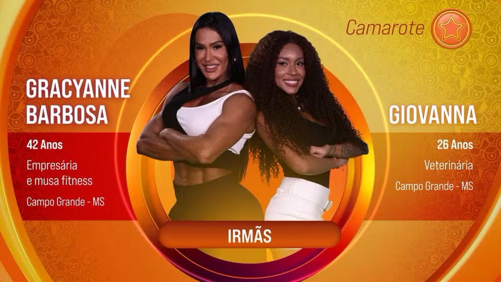 Sendo uma das modelos mais conhecidas de fisiculturismo, musa fitness e ex-mulher do cantor Belo, Gracyanne Barbosa está acostumada com a fama, apesar de ser uma pessoa mais fechada, como Giovanna, irmã caçula da influenciadora, a define. A médica veterinária de 26 anos, inclusive, será sua dupla no grupo Camarote, do BBB 25, e já chega animada para esse novo desafio, disposta a compartilhar com o público outras curiosidades da convivência com a irmã.