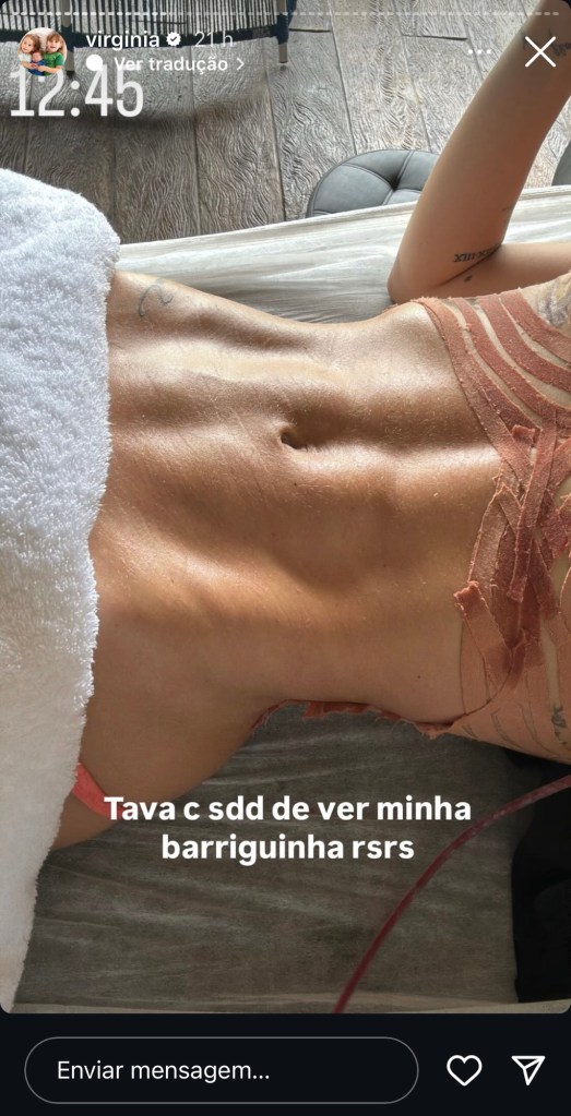 “Tava com saudade de ver minha barriguinha”, escreveu Virginia ao exibir o umbigo após a retirada da hérnia. Atualmente em Mangaratiba, a influenciadora está sendo acompanhada por uma fisioterapeuta. Em seus stories, ela mostrou parte do processo, incluindo a retirada do taping – fitas aplicadas para ajudar na cicatrização e redução de inchaço.