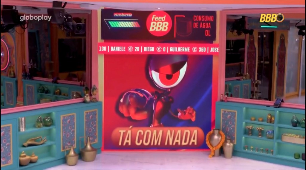 Uma sirene toca em toda casa e os participantes recebem o aviso da punição. O Feed BBB mostra o consumo de água zerado, e Camilla avisa ao resto dos brothers: “Mano, não tem água”.