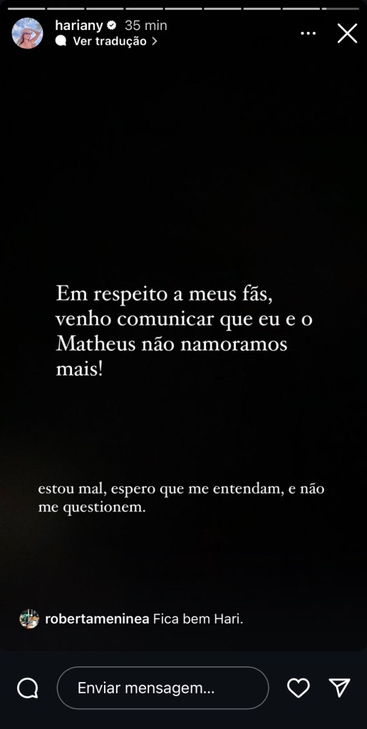 A estrela disse que não está com a separação e pediu respeito neste momento. “Em respeito a meus fãs, venho comunicar que eu e o Matheus não namoramos mais! Estou mal, espero que me entendam, e não me questionem”, afirmou ela.