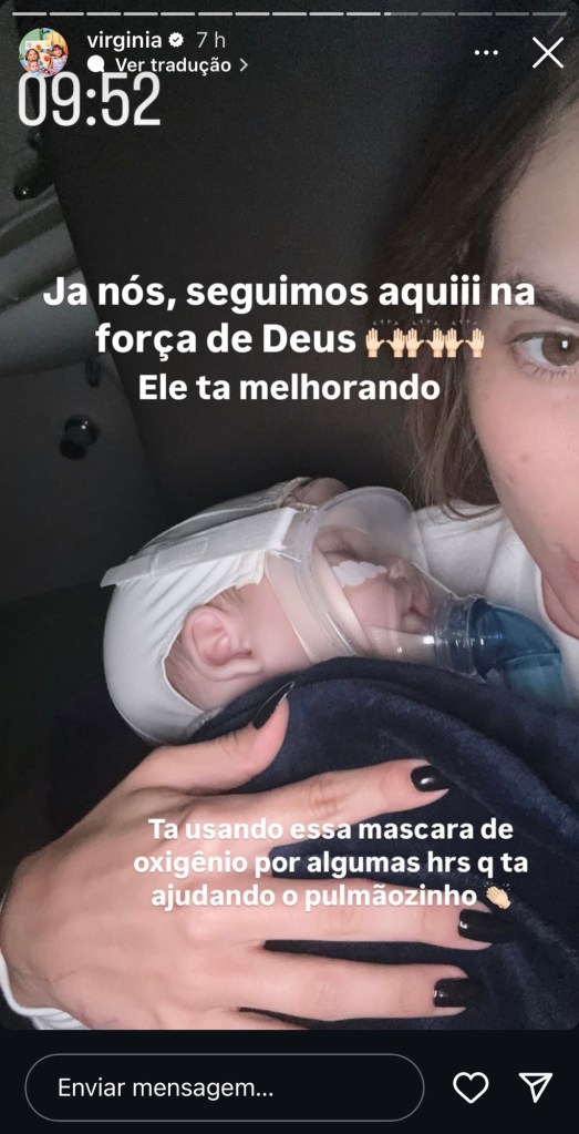 “Já nós seguimos aqui na força de Deus. Ele tá melhorando. Tá usando essa máscara de oxigênio por algumas horas que tá ajudando o pulmãozinho”, legendou ela a foto em que o caçula está em seu colo.