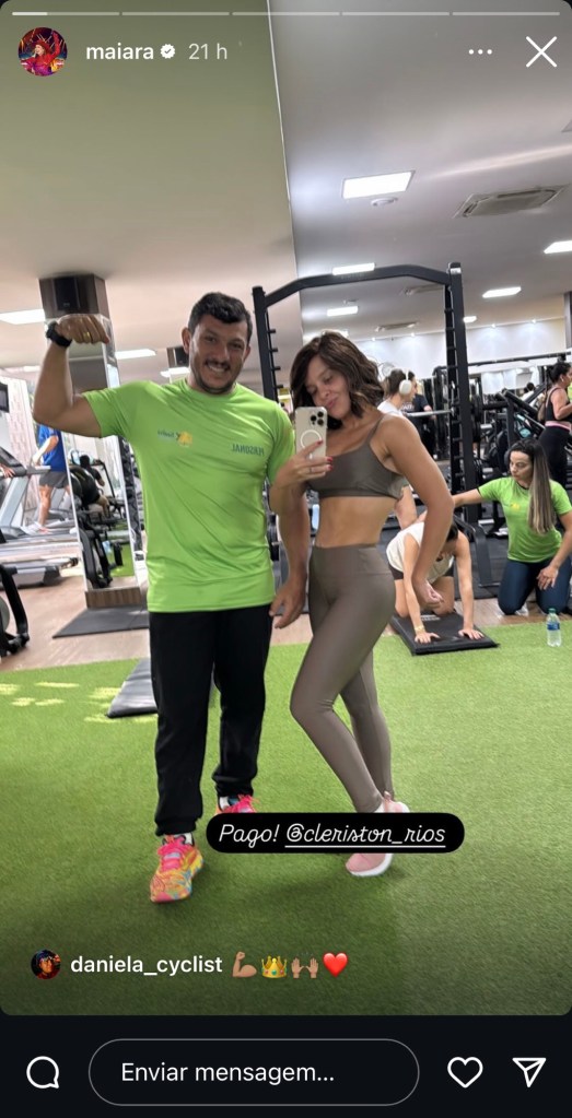 No clique, Maiara aparece ao lado de seu personal trainer, usando um look fitness que deixou à mostra a cinturinha fininha e seus braços definidos. Orgulhosa do esforço, a sertaneja celebrou o treino com a legenda curta e direta: “Pago!”.