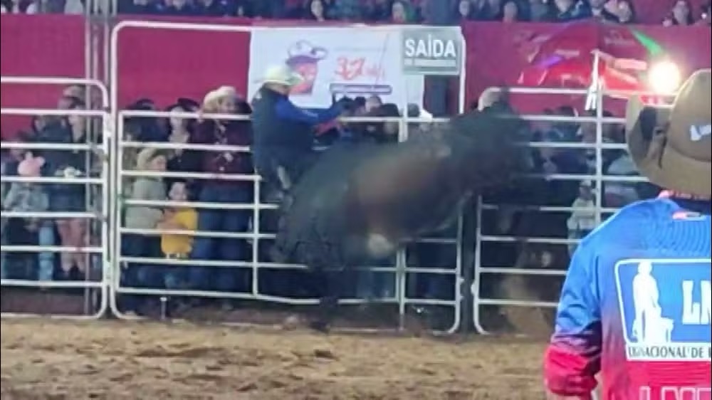Um vídeo obtido pela EPTV, afiliada da TV Globo, nesta terça-feira (8) mostra o momento em que o touro atinge Xavante, que havia subido em um dos portões ao redor da arena.