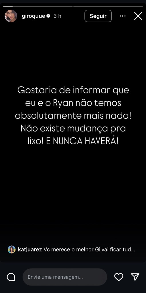 Logo após o anúncio, Giovanna explicou o motivo do rompimento e fez acusações sérias ao ex-companheiro: “Ele é um manipulador, narcisista, tóxico. Essa é verdade! E realmente, eu estava completamente cega em acreditar que se poderia mudar alguém. NÃO SE PODE MUDAR QUEM NÃO QUER MUDANÇA. Essa é verdade! Vamos aguardar os próximos capítulos desse personagem!”