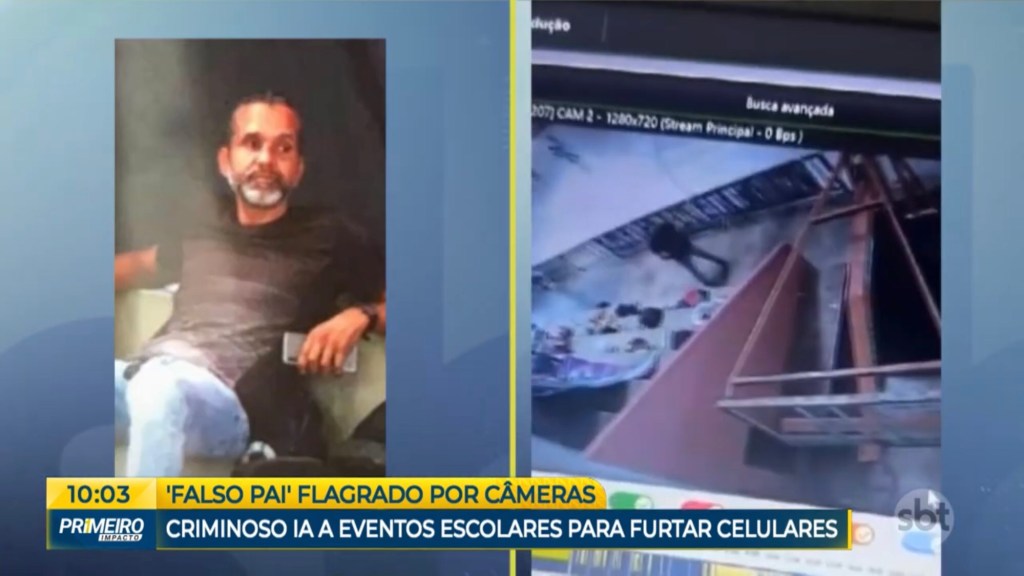 Imagens de câmeras de segurança mostram o suspeito circulando livremente entre crianças e adolescentes na quadra. Em determinado momento, ele sobe as arquibancadas e senta-se próximo às bolsas de alunos Em seguida, o homem se dirige a uma área de maior movimentação, onde consegue subtrair ao menos dois aparelhos celulares, colocando-os nos bolsos da calça sem levantar suspeitas.