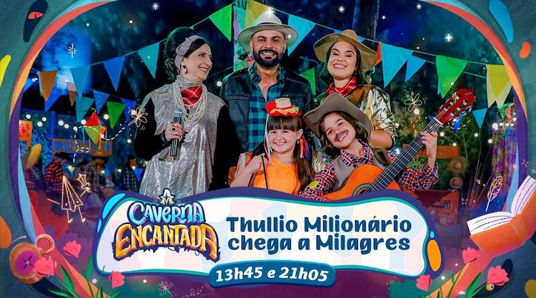 As melhores surpresas moram em Milagres! No capítulo de A Caverna Encantada de hoje (26), O cantor Thullio Milionário chega a Milagres e, com a ajuda de Fafá, tenta conquistar MC Normaliza e DJ Elok, alter egos de Norma e Elisa, para gravar um clipe de festa junina.