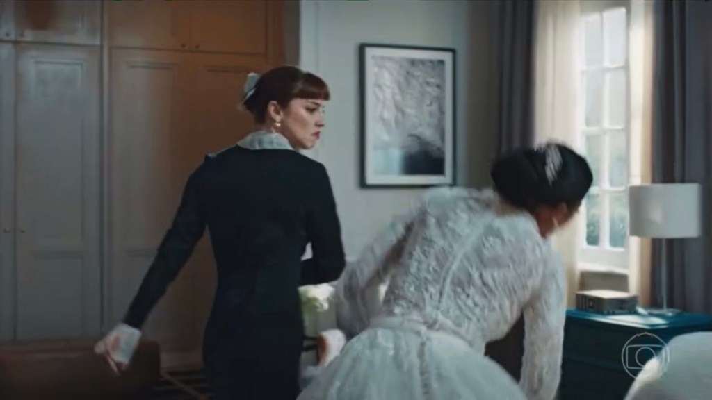 “Ah, eu vim te prestigiar… Se você tivesse pedido a minha ajuda, eu teria escolhido um vestido de noiva ainda mais romântico”, provocará a diretora.