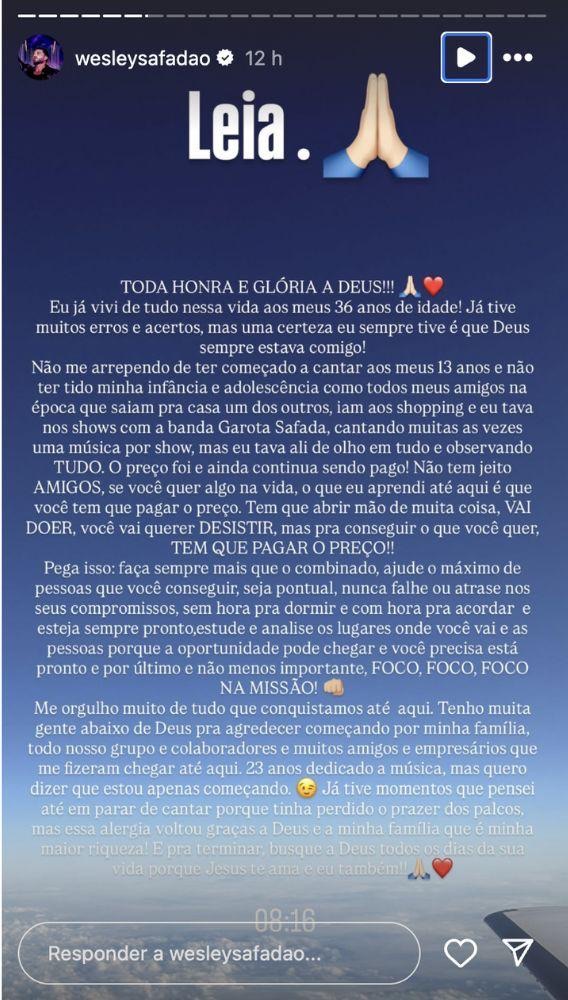 Wesley Safadão decidiu ir até as redes sociais fazer um desabafo sobre os desafios que já enfrentou na sua carreira. Cantando desde pequeno, o cantor comentou sobre as coisas que precisou abrir mão para conseguir o que tanto sonhava e fez uma reflexão sobre a vida e a realização de sonhos.