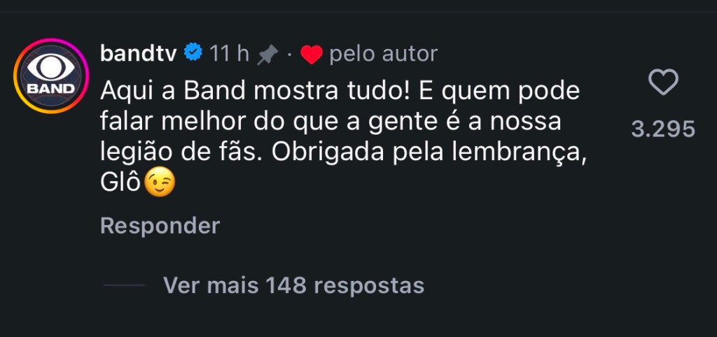 “Aqui a Band mostra tudo! E quem pode falar melhor do que a gente é a nossa legião de fãs. Obrigada pela lembrança, Glô”, escreveu o perfil oficial da Band em seu Instagram.