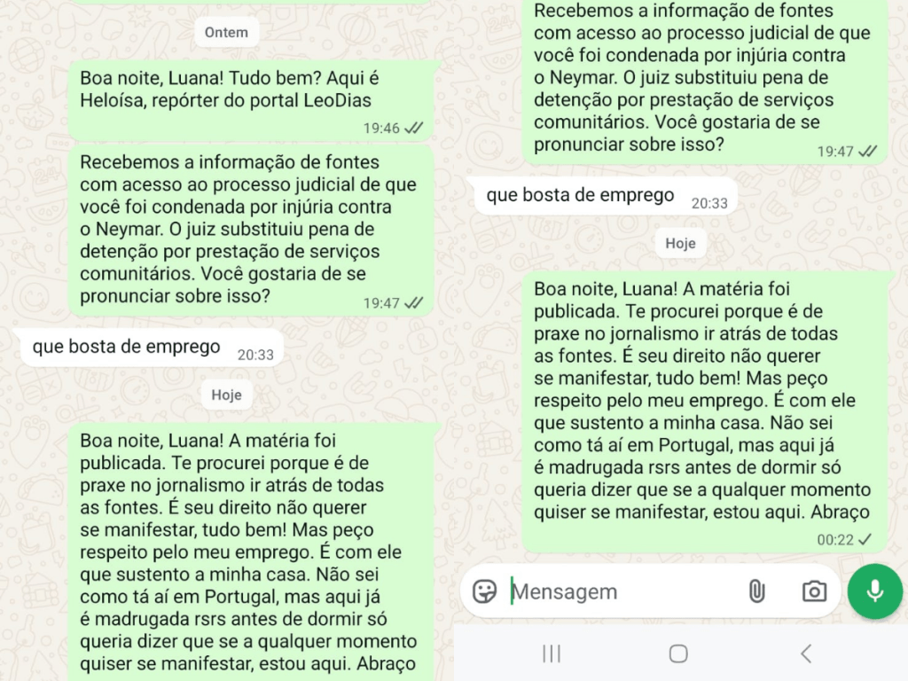 “Boa noite, Luana! A matéria foi publicada. Te procurei porque é de praxe no jornalismo ir atrás de todas as fontes. É seu direito não querer se manifestar, tudo bem! Mas peço respeito pelo meu emprego. É com ele que sustento a minha casa. Não sei como tá aí em Potugal, mas aqui já é madrugada rsrs antes de dormir só queria dizer que se a qualquer momento quiser se manifestar, estou aqui. Abraço”