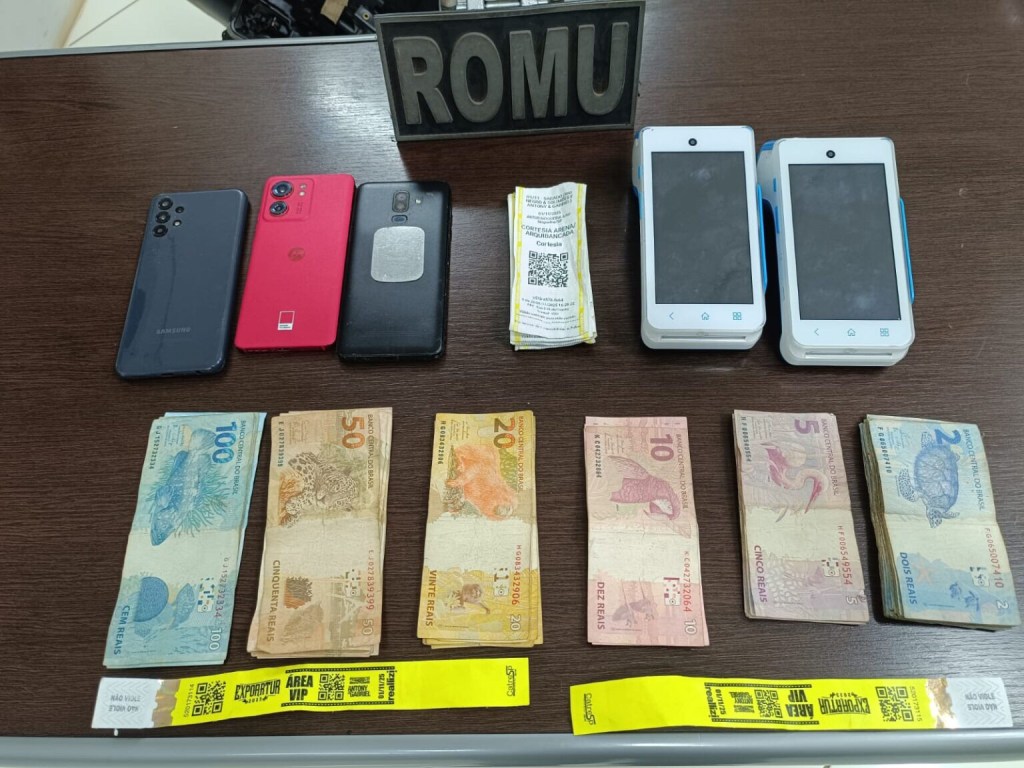 Os agentes se deslocaram até o local e conseguiram localizar os suspeitos com as mesmas características informadas. Durante revista pessoal, com um deles foram encontrados um celular Samsung, R$ 1.300 em dinheiro e 13 ingressos cortesia. Já com o outro rapaz, os guardas localizaram um celular Samsung e R$ 391 em espécie.