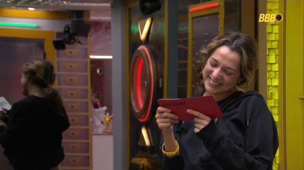 “Samira, você ganhou a sétima liderança do BBB 26 e, por ter chegado ao Top 10, você garantiu o prêmio da prova de R$ 100 mil”, diz a carta.